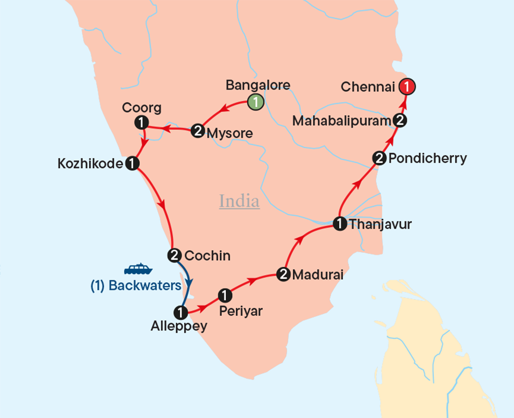 Welcome to India and to the beautiful and vibrant South. This region is known for its unique culture, rich history, flavourful cuisine and stunning natural beauty. There’s a warmth to this part of the country that you’ll feel right away — from the people to the landscapes and the food. We’ll begin our journey in Bangalore, officially called Bengaluru. It’s one of India’s most forward-thinking cities and is often referred to as the Silicon Valley of India. But beyond the modern edge, you’ll find green parks, colourful markets, friendly cafés and a lovely blend of tradition and innovation. Settle into your hotel tonight and enjoy that familiar excitement and calm that comes with arriving somewhere new.
